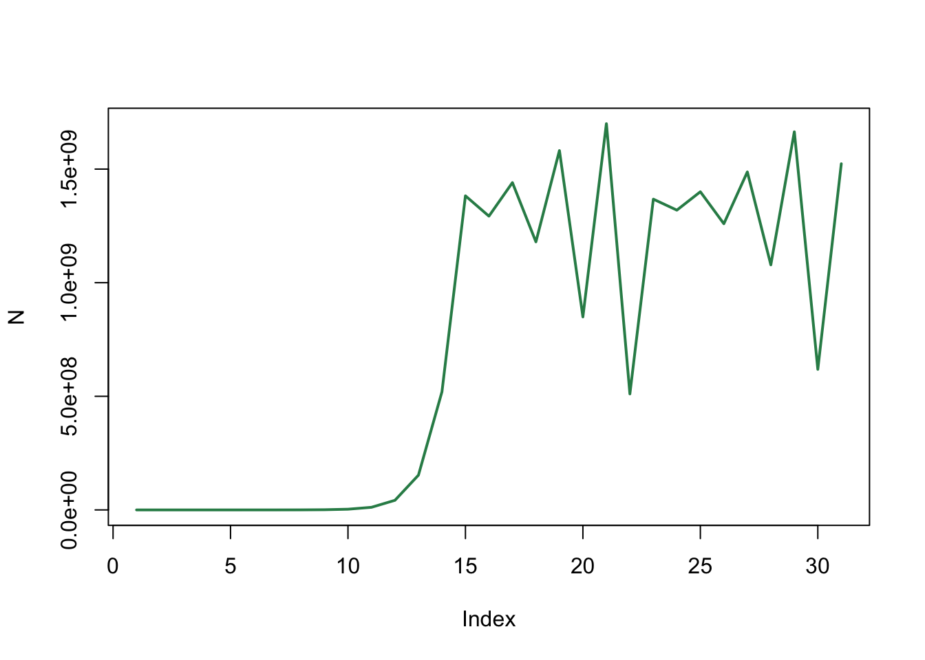 plot(N, type='l', col="seagreen", lwd=2)We zien dat de konijnenpopulatie naar een ander evenwicht gaat, die ongeveer rond 1 miljard (1e+09) lijkt te liggen. Dit klopt met onze eerdere bepaling van de evenwichtwaarde: \(N_{evenwicht}=\frac{b-1}{d}=\frac{2}{2e-9} = 1e9\). Opvallend is dat de populatie een beetje rond deze waarde blijft schommelen.