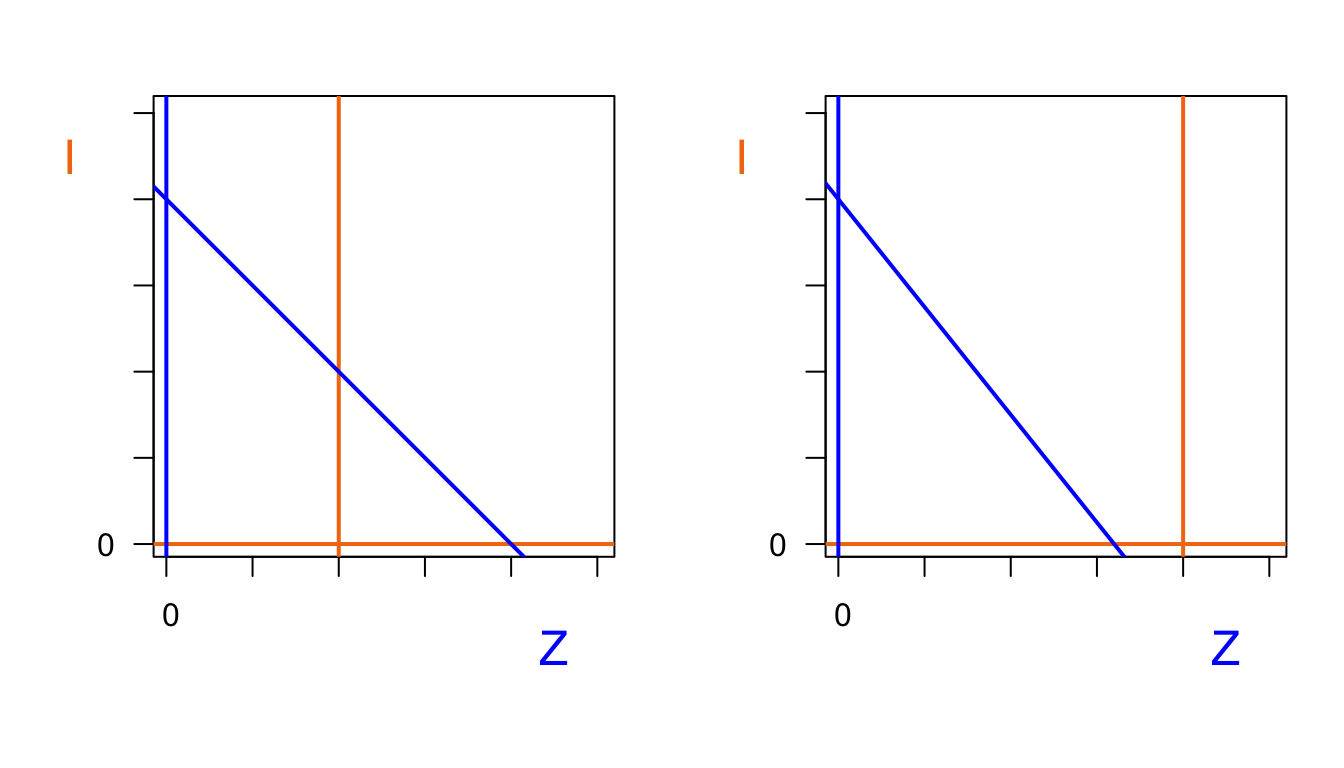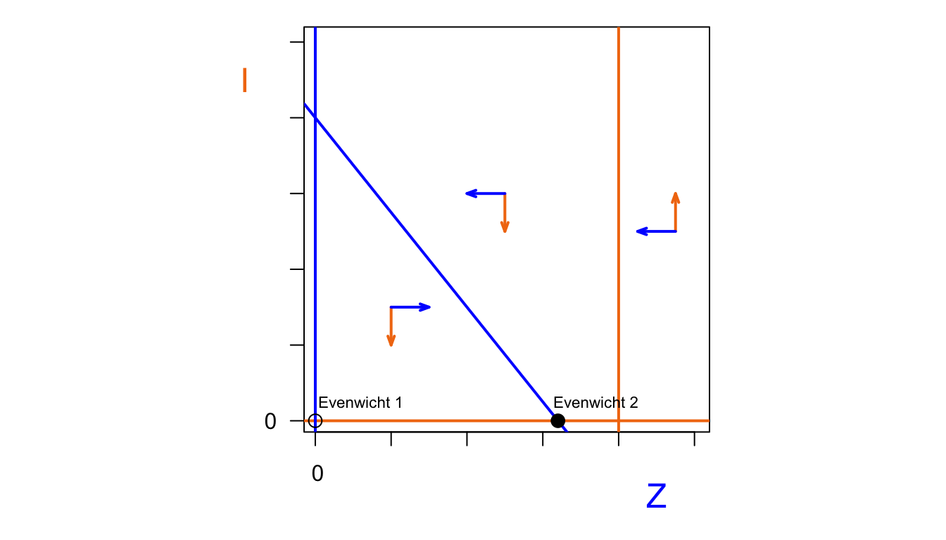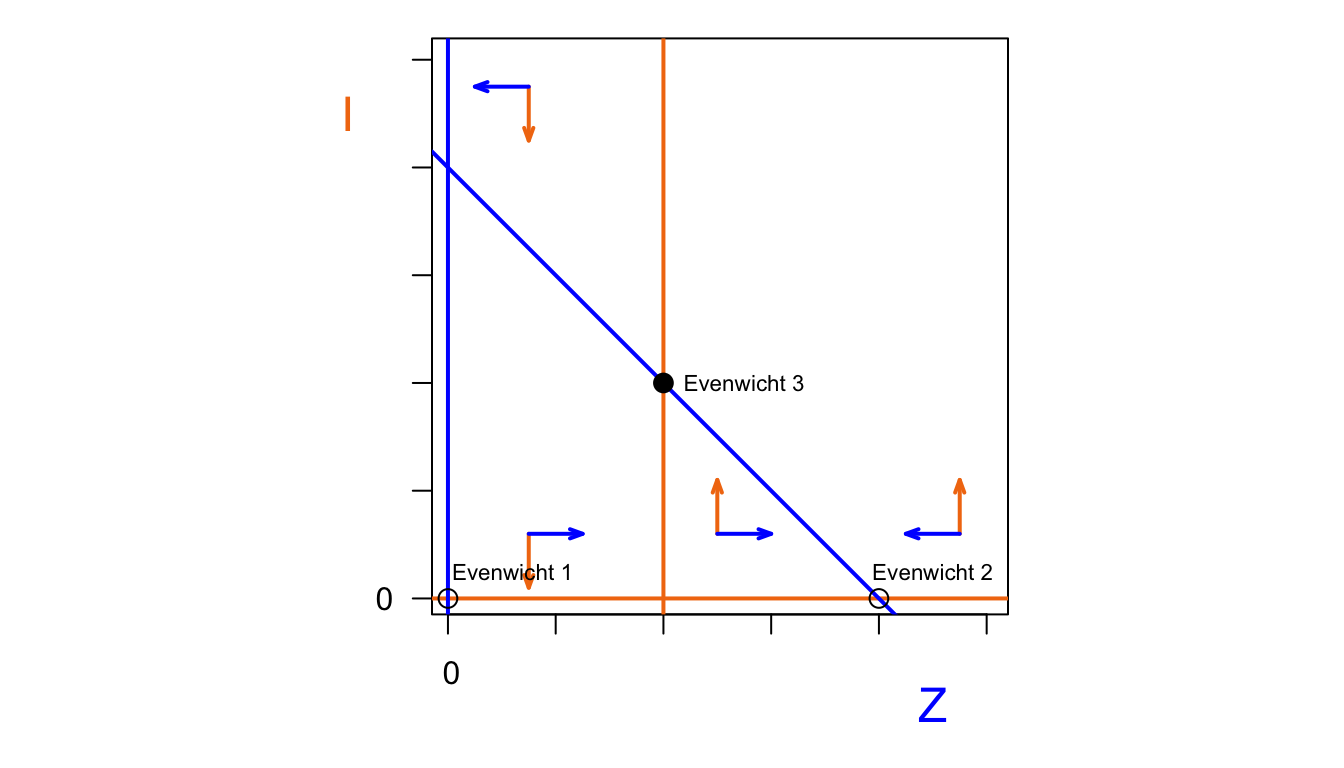i. De enige mogelijkheid waarin beide populaties overleven is als hun groeisnelheden precies even groot zijn. Dan blijft de populatie ergens op de nullcline hangen. Dit is echter niet heel aannemelijk en een kleine verstoring zal dit “evenwicht” verbreken.