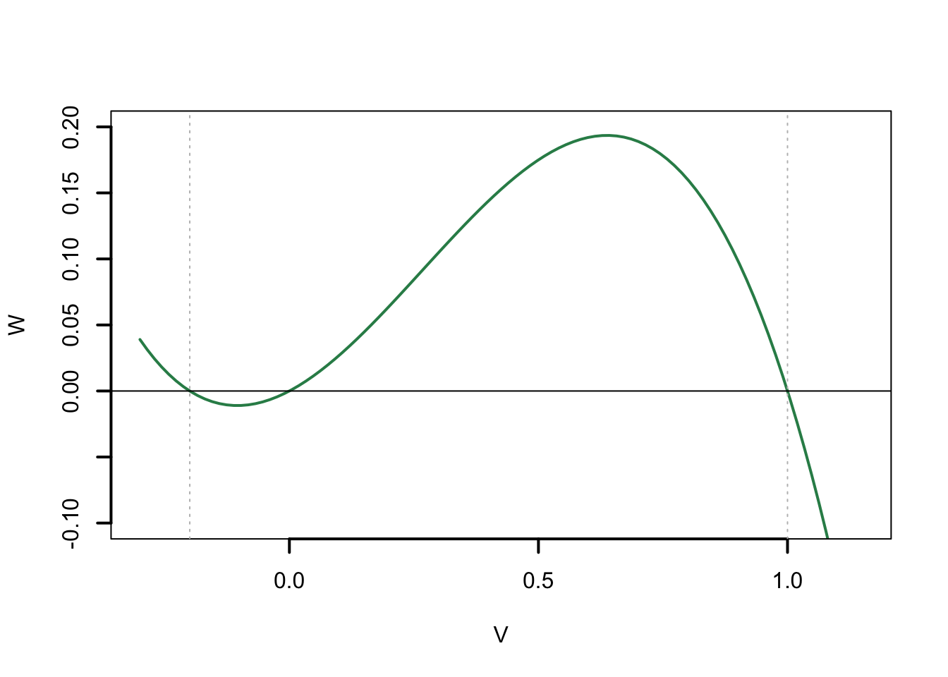 \[\begin{align*} \mathchoice{\frac{\mathrm{d}V} {\mathrm{d}t}}{\mathrm{d}V/\mathrm{d}t} {\mathrm{d}V/\mathrm{d}t} {\mathrm{d}V/\mathrm{d}t} = -V(V-a)(V-1) - W &= 0 \quad \text{ als...}\\ W &= -V(V-a)(V-1)\\ \end{align*}\]