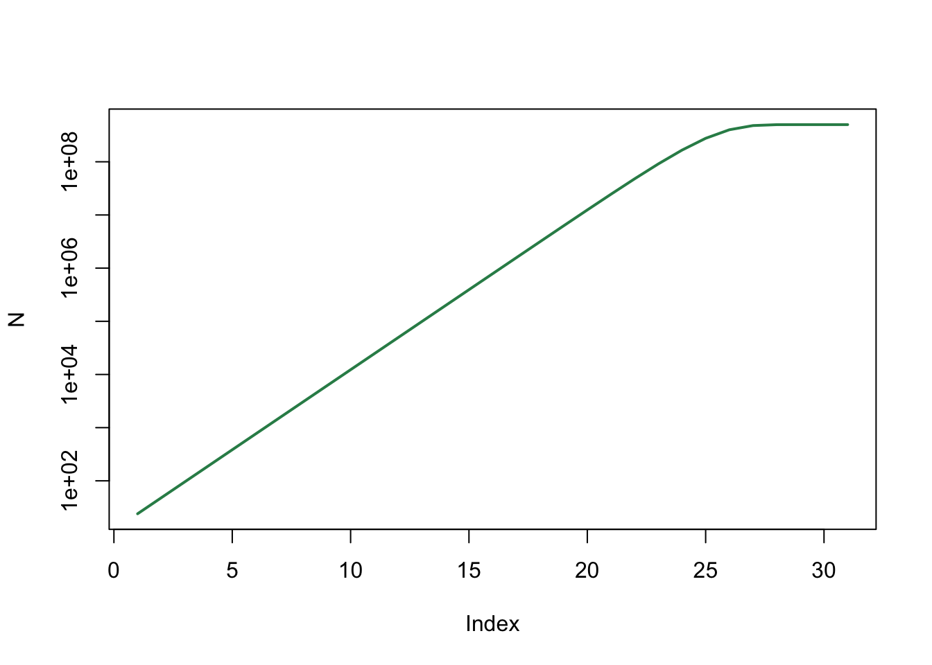 plot(N, type='l', log="y", col="seagreen", lwd=2)We zien dat er nog steeds sprake is van exponentiële groei, omdat we met een logaritmische y-as een rechte lijn krijgen.