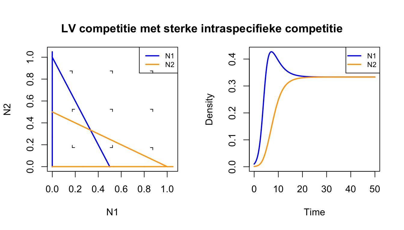#Laad het grind.R-script insource("https://tbb.bio.uu.nl/rdb/grindR/grind.R")# Definitie van model. model <-function(t, state, parms) {with(as.list(c(state,parms)), { dN1 <- r*N1*(1-c11*N1-c12*N2) dN2 <- r*N2*(1-c22*N2-c21*N1)return(list(c(dN1, dN2))) }) } p <-c(r=1,c11=2,c22=2,c12=1,c21=1) #parameters met intra sterker dan inters <-c(N1=0.01,N2=0.001) # kleine begin-dichthedencolors[1] ="blue"colors[2] ="orange"par(mfrow=c(1,2)) # maak twee plot-ruimtesplane(vector=T,grid=3) # faseruimte run(traject=F,tstep=0.1,col="black",tmax=50) # numerieke oplossingmtext("LV competitie met sterke intraspecifieke competitie", cex=1.2,font=2,side =3, line =-3, outer =TRUE)