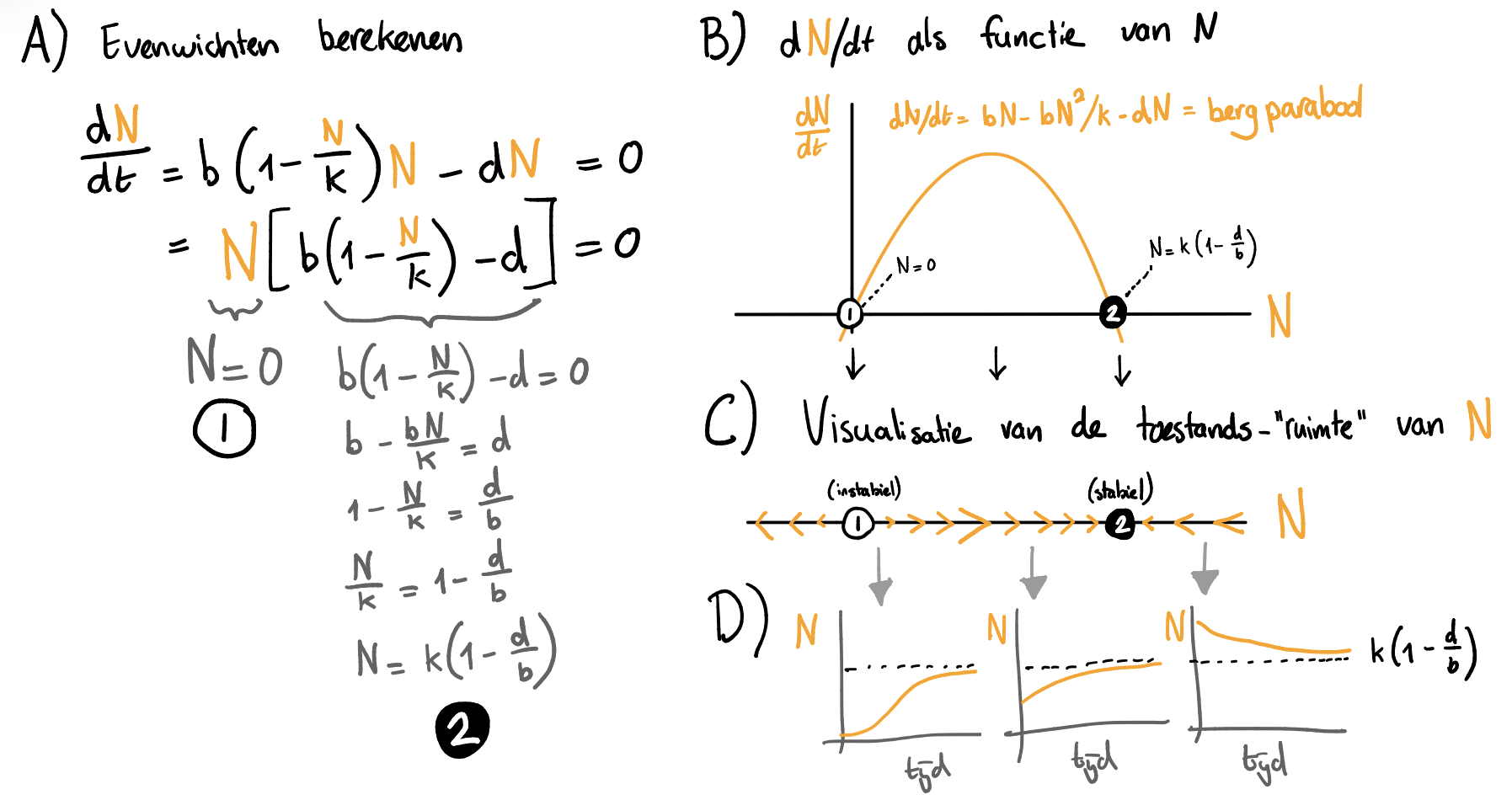 Zoals je in het vorige hoofdstuk geleerd hebt, kunnen we ODEs eenvoudig analyseren door ons af te vragen: wanneer is er geen groei meer? Wanneer is \( \mathchoice{\frac{\mathrm{d}N} {\mathrm{d}t}}{\mathrm{d}N/\mathrm{d}t} {\mathrm{d}N/\mathrm{d}t} {\mathrm{d}N/\mathrm{d}t} \) gelijk aan \(0\)? Deze relatief eenvoudige berekening wordt weergegeven in Figuur 12.2A. De rechterzijde van dit figuur geeft aan dat je ook zonder berekeningen inzicht kunt krijgen in een ODE. Dit doen we door eerst een de groeifunctie (dus \(dN/dt\)) te schetsen als functie van \(N\). In Figuur 12.2B zie je hoe onze ODE met dichtheidsafhankelijke geboorte een bergparabool oplevert1, een functie die op twee punten gelijk is aan \(0\). Dit zijn diezelfde punten die we met berekeningen hebben bepaald. Op deze punten is de populatie in evenwicht: deze kan niet groeien of krimpen. In Figuur 12.2C visualiseren we wanneer de populatie zal groeien of krimpen in een zogeheten toestands-“ruimte”2. Als de bergparabool boven 0 komt is er groei mogelijk, en zal \(N\) groter worden. Dit geven we weer met pijltjes naar rechts (meer \(N\)). Als de bergparabool onder 0 komt, is er afname, en zal \(N\) kleiner worden (pijltjes naar links). Op de evenwichtspunten is er geen verandering, en tekenen we een cirkel om aan te geven dat hier een evenwicht zit. Een figuur zoals die in Figuur 12.2C, waar we de zogeheten toestandsruimte opdelen en annoteren met pijltjes, wordt ook wel een faseportret genoemd.