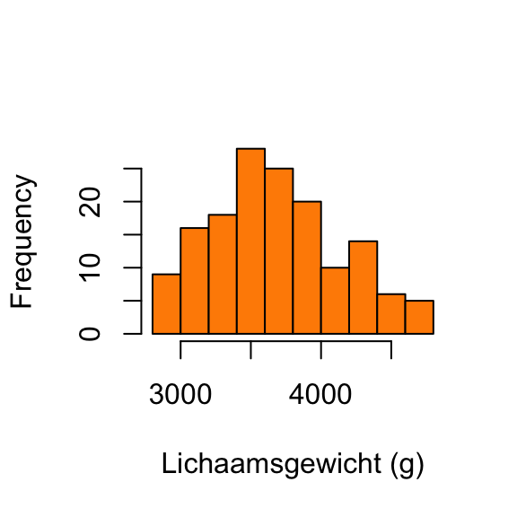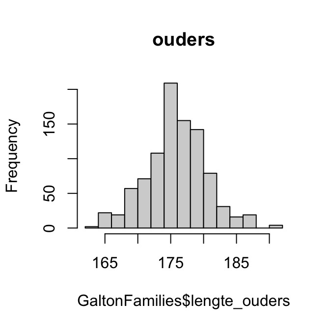 # Laad benodigde pakkettenif (!("HistData"%in%.packages())) { library(HistData) }if (!("ggplot2"%in%.packages())) { library(ggplot2) }# Laad de GaltonFamilies-datasetdata("GaltonFamilies")# Definieer omrekenfactoreninch <-2.54factor_vrouw <-1.08# Corrigeer ouderlengte naar cm en pas factor toe voor moedersGaltonFamilies$mid_parent_height <- inch * ( GaltonFamilies$father + factor_vrouw * GaltonFamilies$mother) /2# Corrigeer kindlengte naar cmGaltonFamilies$childHeightCorrected <- inch * GaltonFamilies$childHeight# Pas correctie toe voor vrouwelijke kinderenGaltonFamilies$childHeightCorrected[ GaltonFamilies$gender =="female"] <- factor_vrouw * GaltonFamilies$childHeightCorrected[ GaltonFamilies$gender =="female" ]# Hernoem eindvariabelen voor plotGaltonFamilies$lengte_ouders <- GaltonFamilies$mid_parent_heightGaltonFamilies$lengte_kinderen <- GaltonFamilies$childHeightCorrected# Maak scatterplotggplot( GaltonFamilies,aes(x = lengte_ouders, y = lengte_kinderen)) +geom_point(alpha =0.8,size =1,color ="darkorange" ) +# geom_abline(# slope = 1,# intercept = 0,# linetype = "dashed",# color = "black"# ) +xlim(150, 205) +ylim(150, 205) +labs(x ="Mid-ouder-lengte (cm)",y ="Lengte kind (cm)",title ="" ) +theme_minimal()