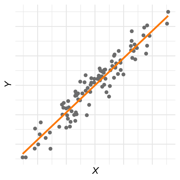 # Laad vereiste pakketten als ze nog niet geladen zijnif (!("MASS"%in%.packages())) { library(MASS) }if (!("ggplot2"%in%.packages())) { library(ggplot2) }# Stel parameters insteekproef_grootte <-100gemiddelden <-c(0, 0)covariantie_matrix <-matrix(c(1, 0.95, 0.95, 1), nrow =2)# Genereer bivariate normale steekproefset.seed(122) # voor reproduceerbaarheiddata <-as.data.frame(mvrnorm(n = steekproef_grootte,mu = gemiddelden,Sigma = covariantie_matrix))names(data) <-c("X", "Y")# Maak de plotggplot(data, aes(x = X, y = Y)) +geom_point(color ="gray50") +geom_smooth(method ="lm", se =FALSE, color ="darkorange", linewidth =1) +labs(x =expression(italic(X)), y =expression(italic(Y))) +theme_minimal() +theme(axis.text.x =element_blank(),axis.text.y =element_blank() )