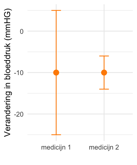 Hieronder zijn voor beide medicijnen het gemiddelde effect geplot (oranje datapunten). De oranje lijnen geven de 95%-betrouwbaarheidsintervallen aan.
