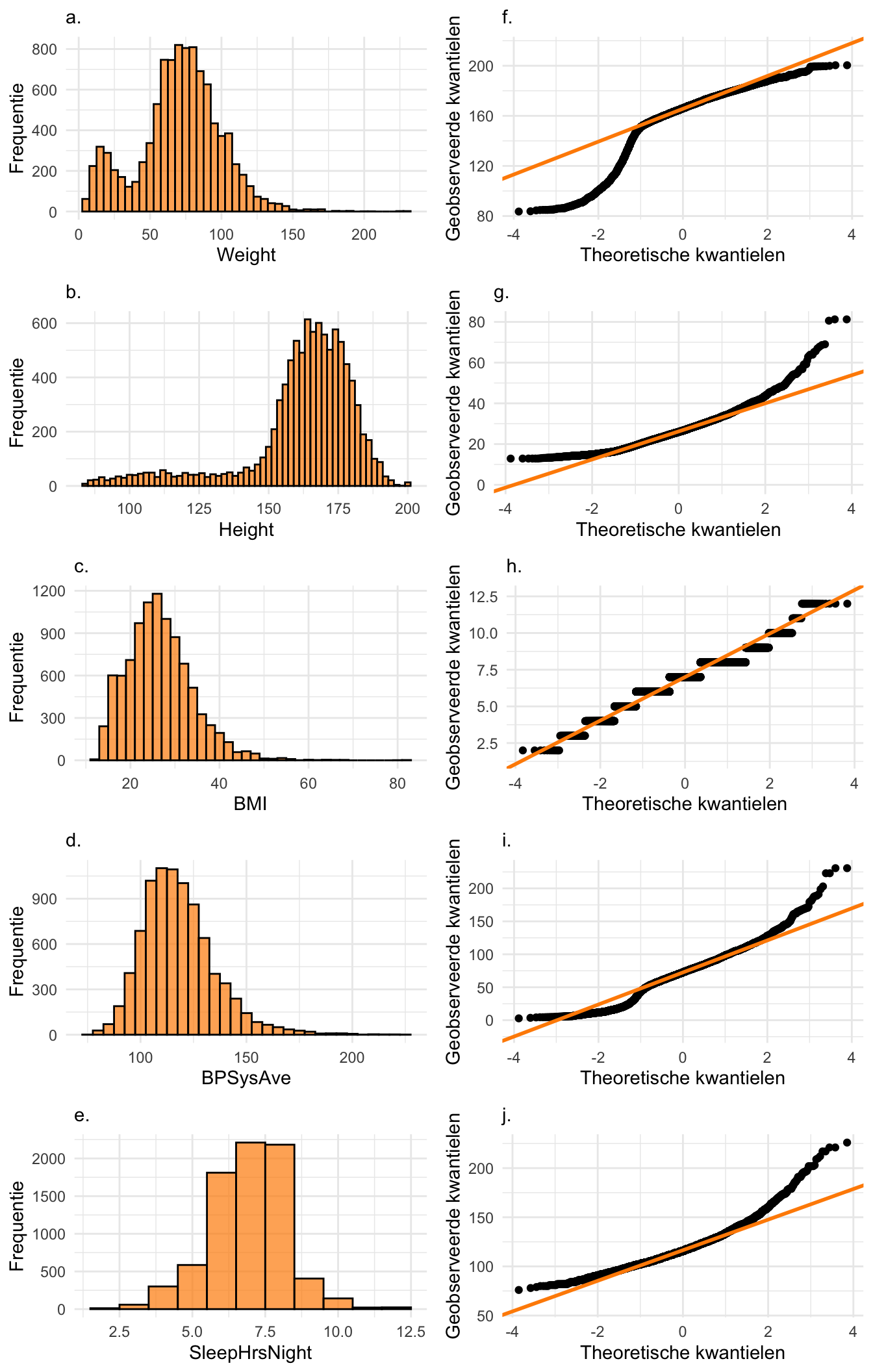 In Paragraaf 24.10 hebben we gezien hoe je kunt onderzoeken of een steekproef van een variabele afwijkingen laat zien van de normale verdeling. Als voorbeeld ga je de variabele Pulse (hartslagfrequentie) onderzoeken uit de NHANES-database.