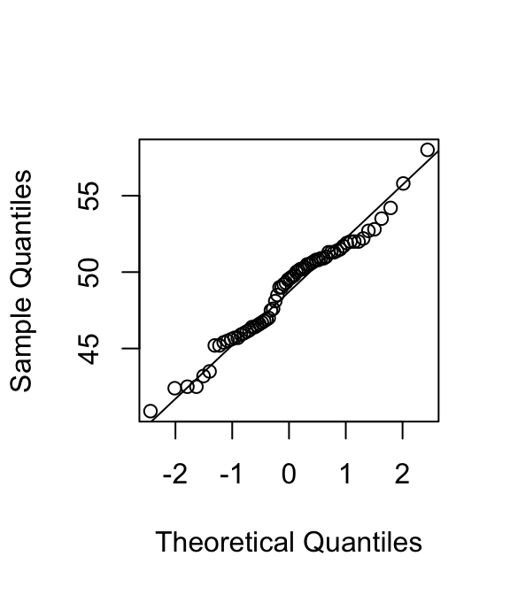 We wegen vier eieren, met de volgende gewichten: 51,7g; 50,3g; 48,4g; en 51,9g. Gebruik het stappenplan hierboven om de volledige \(t\)-toets uit te voeren.